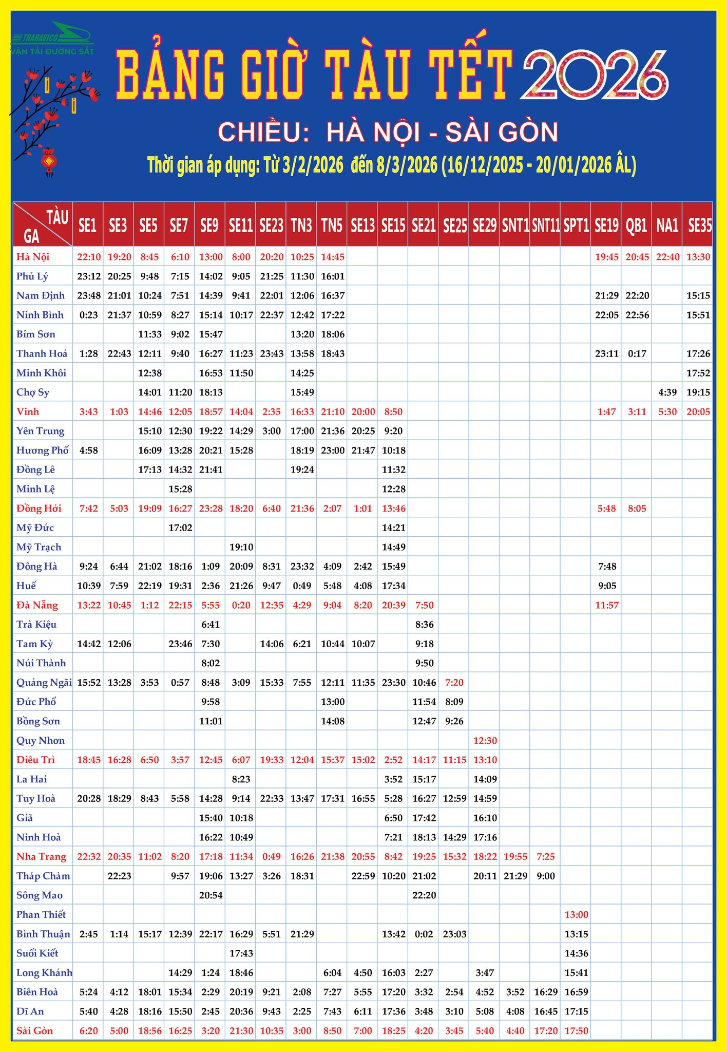 Bảng Giờ Tàu Tết 2025 Bính Ngọ