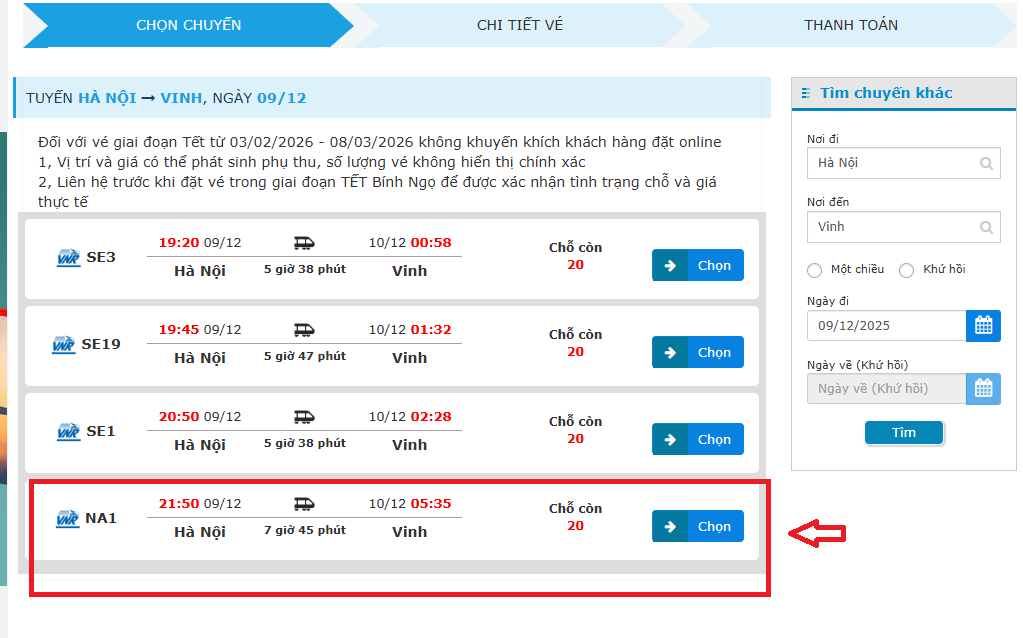 Bước 1: Chọn tuyến Hà Nội - Vinh, ngày đi - về và tìm. Chọn chuyến tàu NA1 (tàu chất lượng cao).